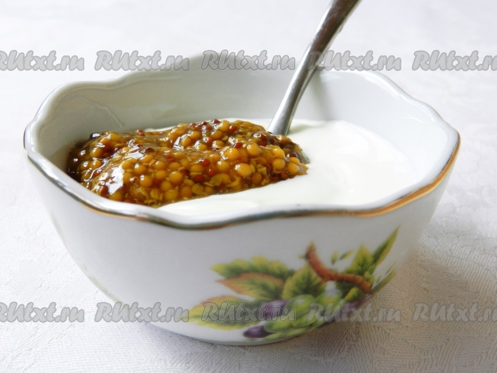 Приготовить пикантный соус для салата. Для этого смешать сметану с горчицей, добавить по вкусу лимонный сок.