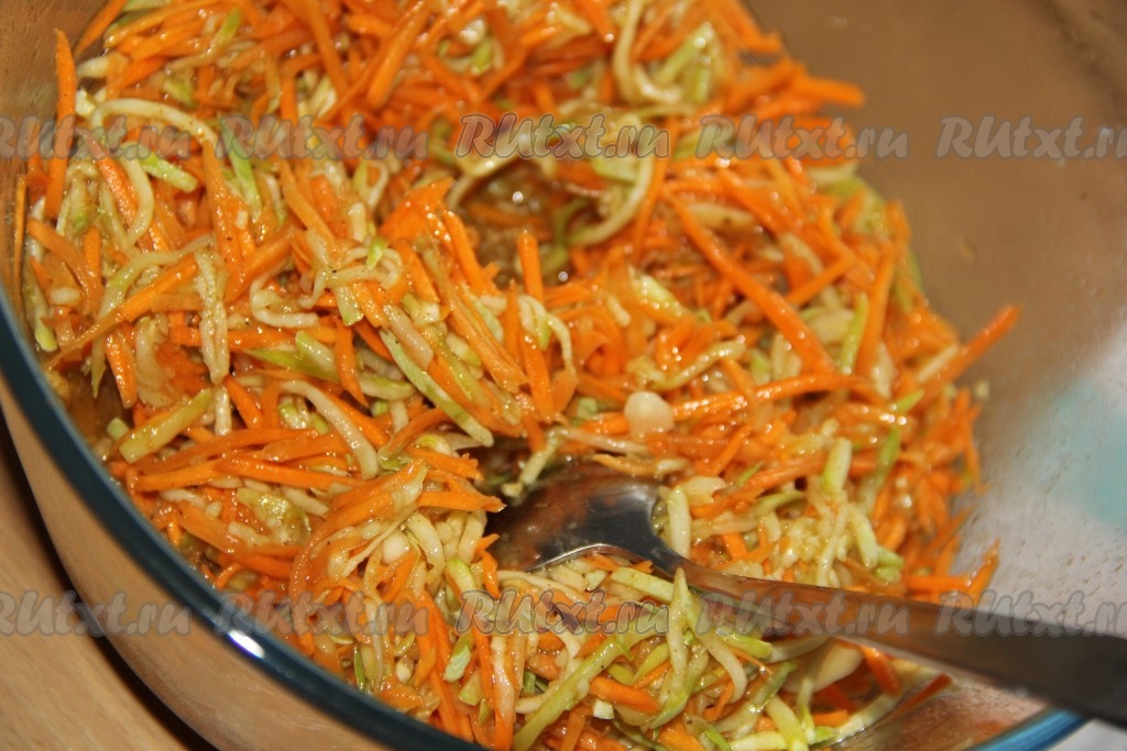 Тщательно перемешать овощи, влить уксус и масло. Хорошо перемешать кабачково-морковную смесь, накрыть крышкой и поставить на сутки в холодильник.