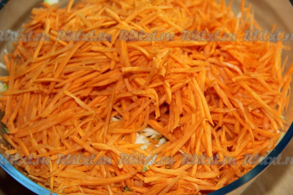 Морковку также нужно натереть на тёрке для корейской моркови, а затем выложить к натёртым кабачкам.