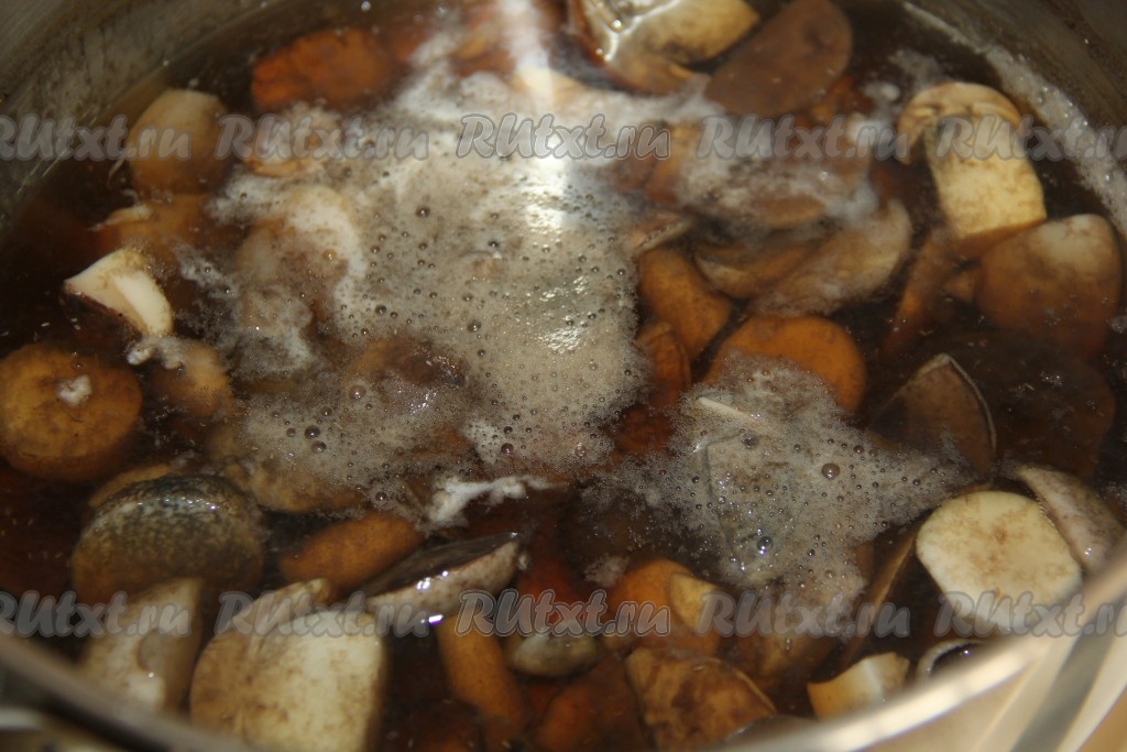 Когда вода в кастрюле с грибами закипит, убавить огонь и варить 30 минут, снимая пенку.