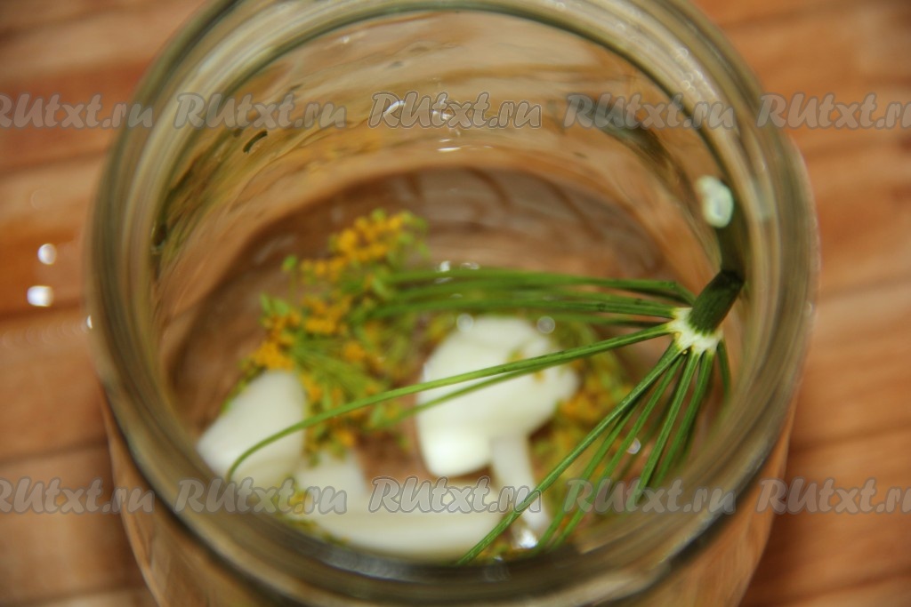 Я предварительно простерилизовала банку на пару, крышку проварила 5 минут в кипящей воде. На дно банки выложить зонтик укропа и пару очищенных зубчиков чеснока, разрезанных на несколько частей.