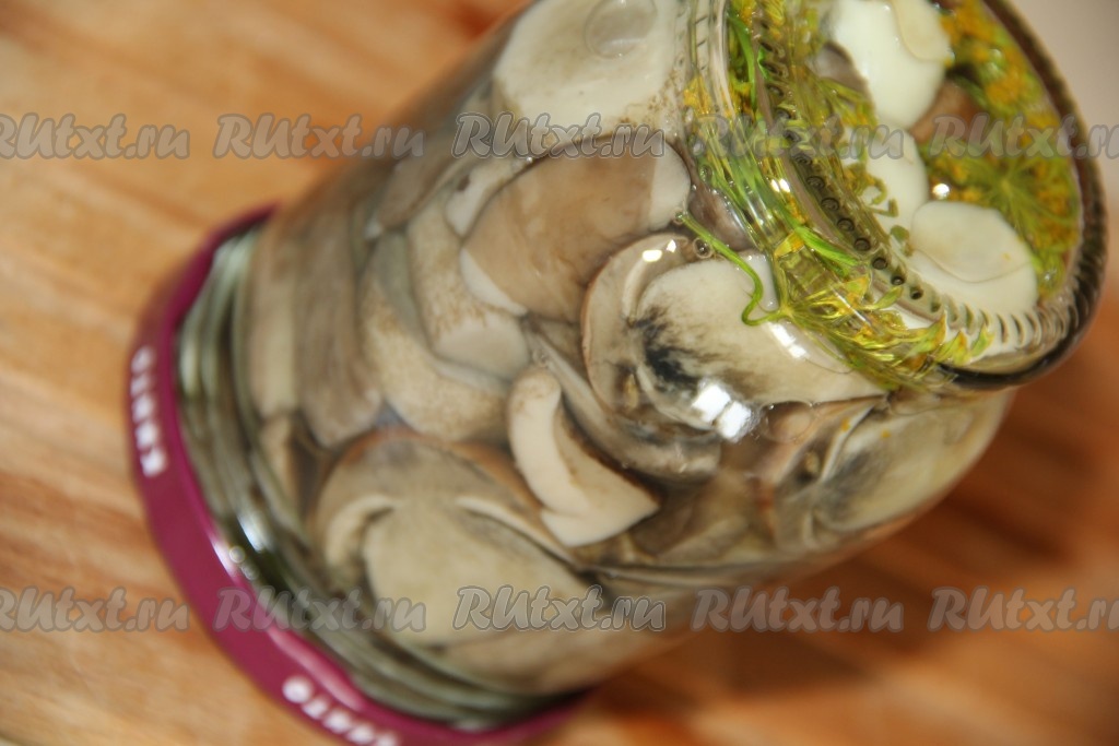 Закрыть банку с лесными грибами в маринаде крышкой, перевернуть вверх дном, укутать со всех сторон, а после полного остывания убрать на хранение в холодильник.