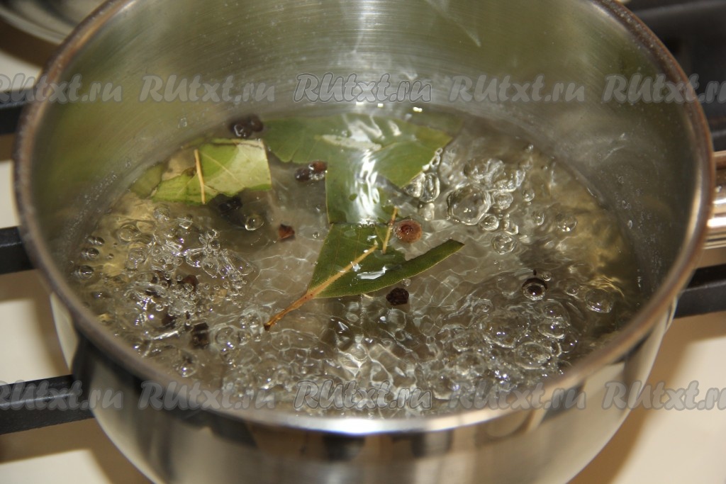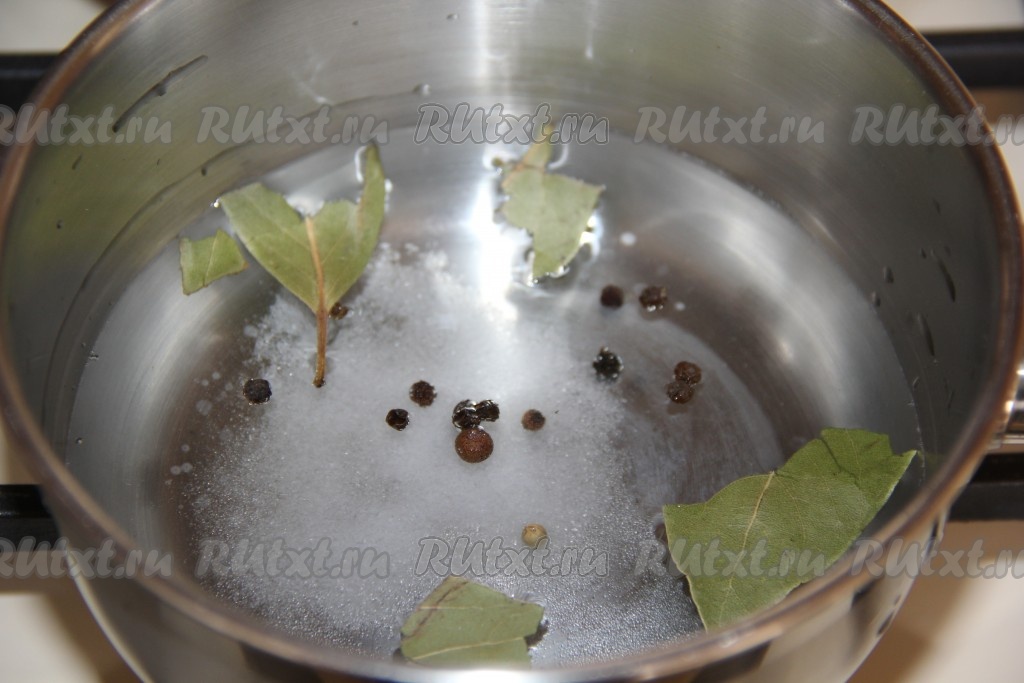 Для приготовления маринада соединить в кастрюле воду, соль, горошины чёрного перца, лавровые листья и сахар.