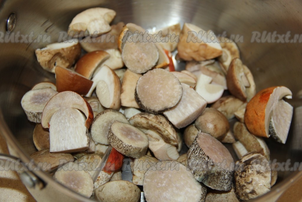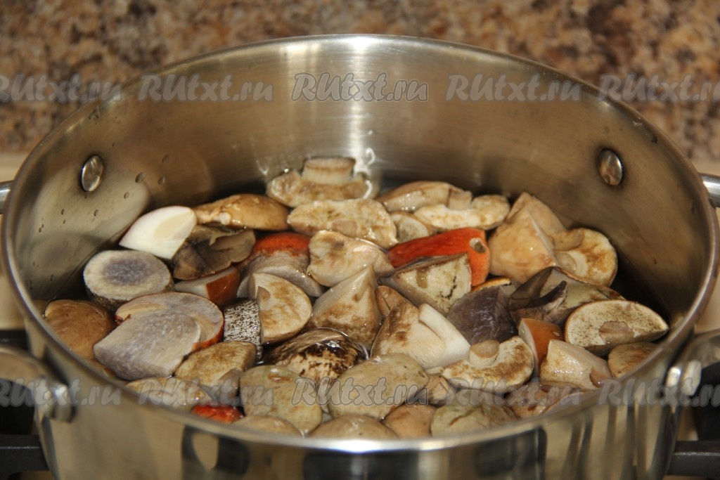 Поместить грибы в кастрюлю, полностью залить холодной водой. Поставить кастрюлю с грибами на огонь.