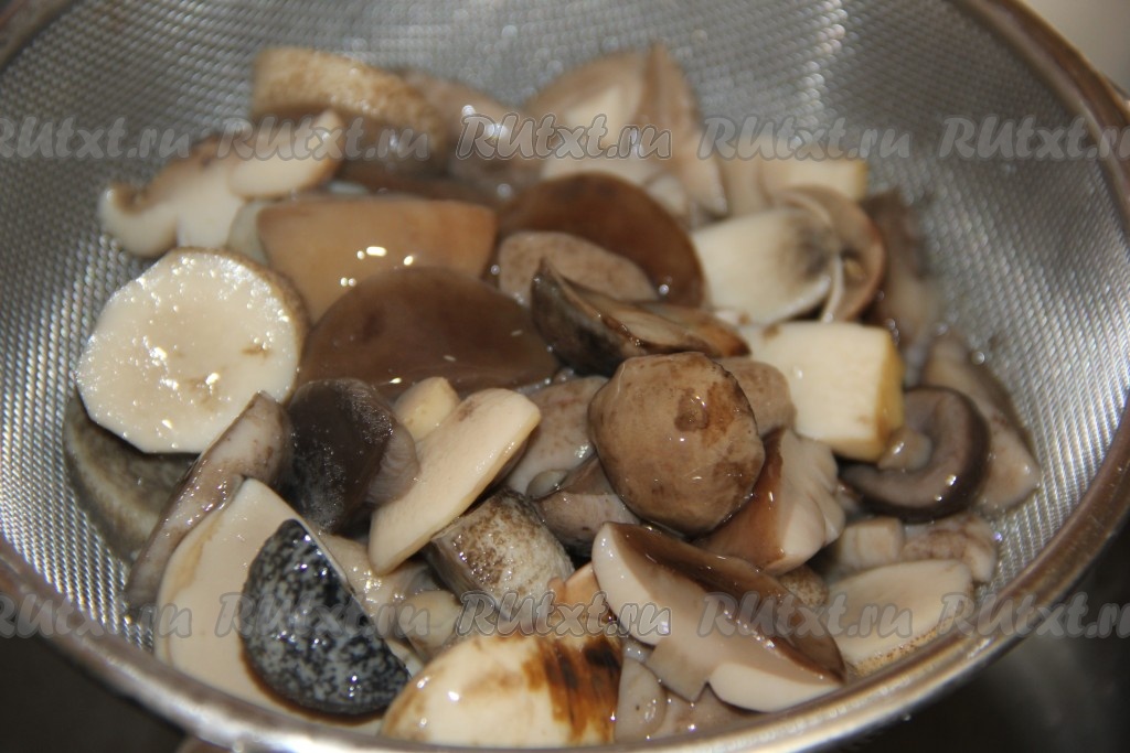 Отваренные грибы откинуть на дуршлаг.