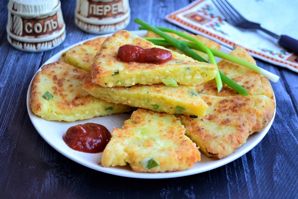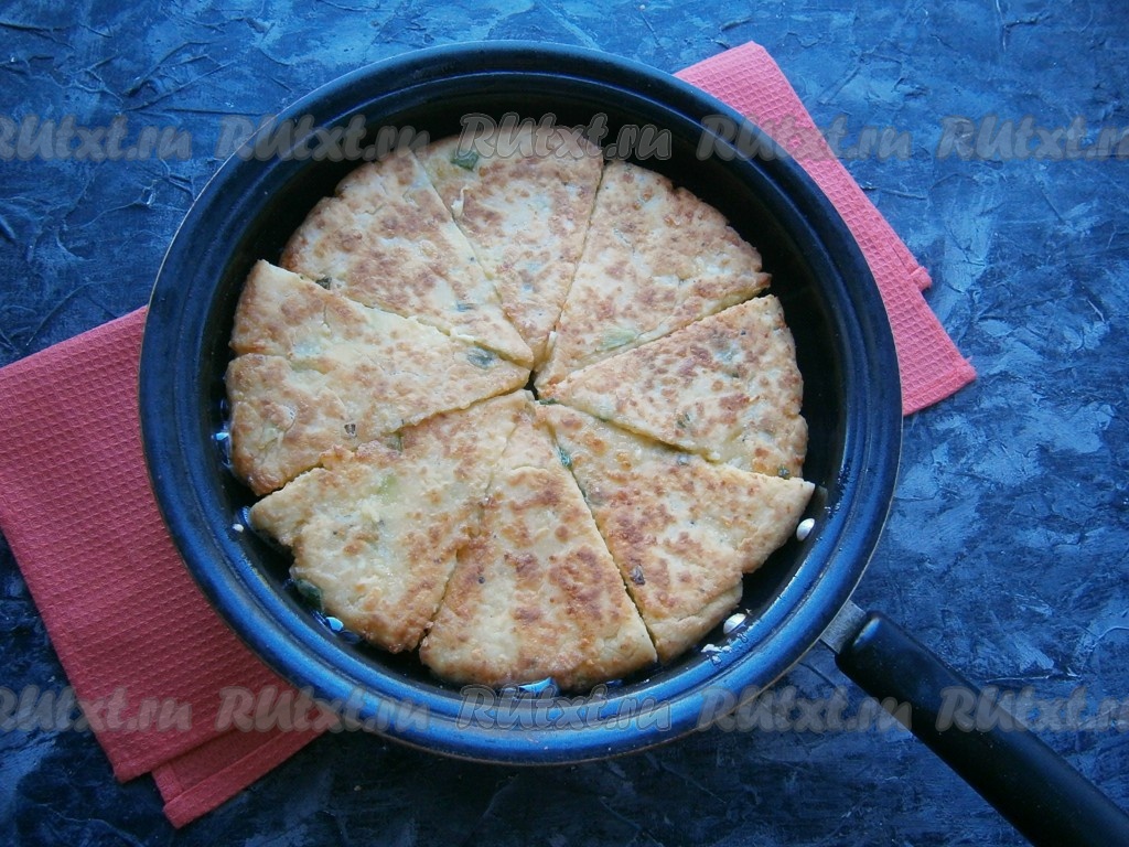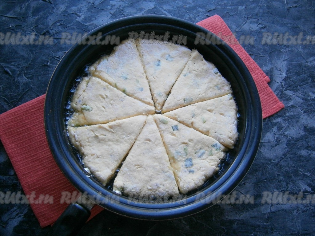 Жарить творожно-сырную лепёшку на сковороде на среднем огне до золотистого цвета (3-4 минуты), после чего каждую часть аккуратно перевернуть вилкой. Жарить вторую сторону около 1-2 минут (до румяности).