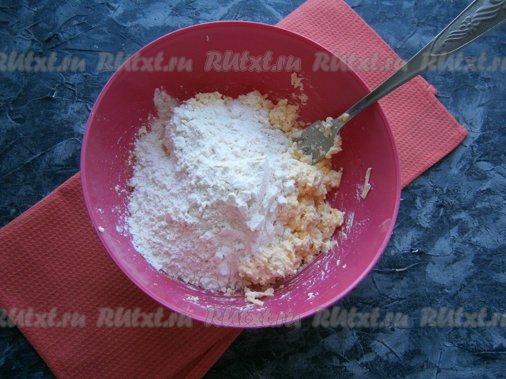 Перемешать творожно-сырную массу и всыпать муку.