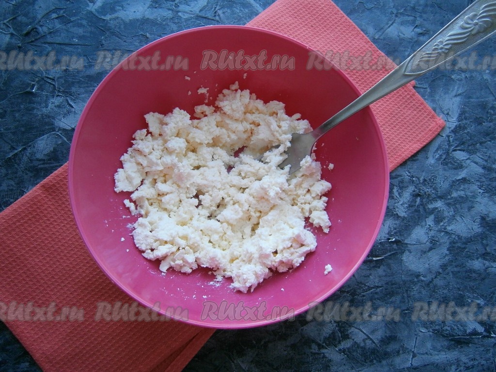 Творог размять вилкой, чтобы не было слишком крупных комков.