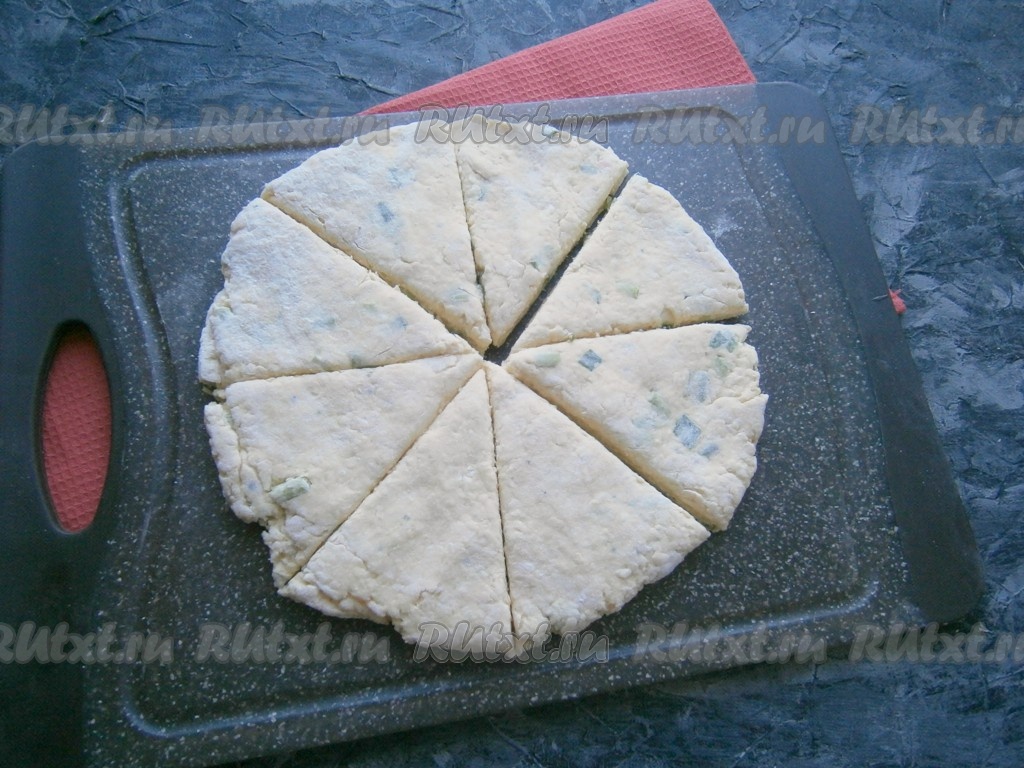 Немного муки насыпать на поверхность стола, руками сформировать лепёшку толщиной около 0,5 см. Разрезать её на 8 частей (секторов).