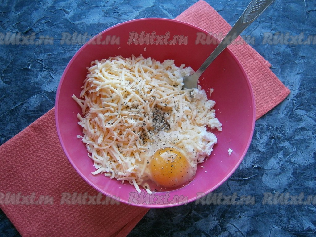 Добавить натёртый на средней тёрке сыр, сырое яйцо, всыпать соль и молотый перец.