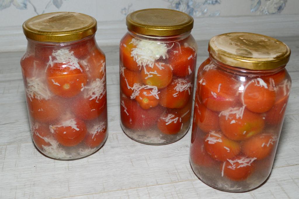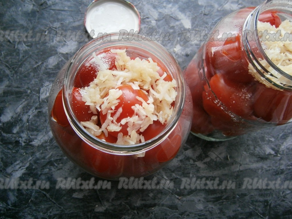 В банки поверх помидоров разместить, чеснок, предварительно очищенный и натёртый на мелкой тёрке (или пропущенный через пресс). В каждую банку объёмом 1,5 литра понадобится около 1 столовой ложки натёртого чеснока.