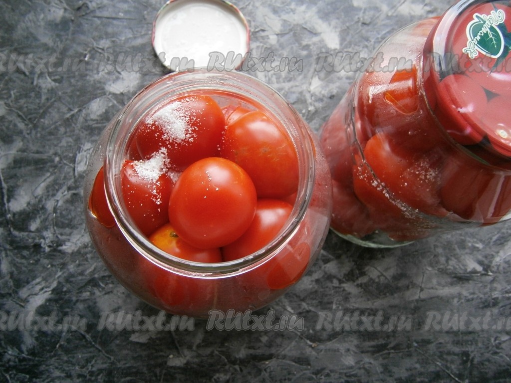 Ещё раз слить воду из баночек в кастрюлю, добавить соль и сахар, довести воду до кипения. В банки с помидорами всыпать лимонную кислоту (в банку объёмом 1,5 литра нужно всыпать 0,5 чайной ложки кислоты).