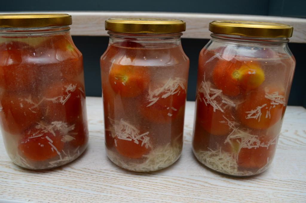 Наверное, многие хозяйки знают рецепт приготовления на зиму помидоров без уксуса под названием "Под снегом". Помидоры получаются сладенькими, очень ароматными и интересно смотрятся в банке - тёртый чеснок красиво распределяется по помидорам, имитируя снег. Я такие помидорчики готовила раньше, они необычайно вкусные. Хочу поделиться рецептом и с вами. Если у вас есть подвал, помидоры можно консервировать с одной заливкой кипятка, если же хранение будет происходить в городской квартире, помидоры лучше заливать кипятком 2 раза - я как раз так и делала. Из данного количества продуктов получается 2 баночки по 1,5 литра.