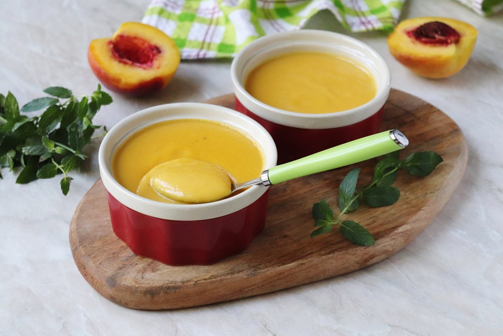 Курд - это наивкуснейший заварной крем-десерт, приготовленный из ягод и фруктов. Предлагаю вашему вниманию рецепт нежнейшего курда из персиков. Готовить мы его будем на основе персикового пюре, а загущать куриными яйцами и сливочным маслом. Курд из персиков можно подать в порционных креманках в качестве десерта, или использовать в качестве крема (например, для прослаивания бисквитов, тортов, пирожных), или как сладкое дополнение к блинам, оладьям, сырникам и т.д.