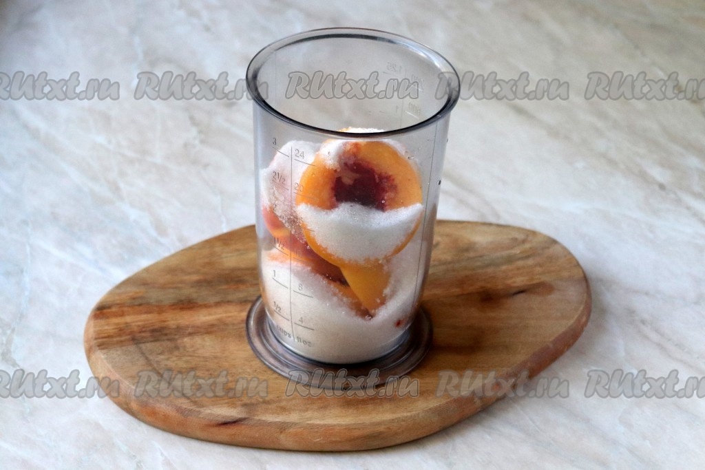 Персики без косточек отправьте в чашу блендера и добавьте сахарный песок.