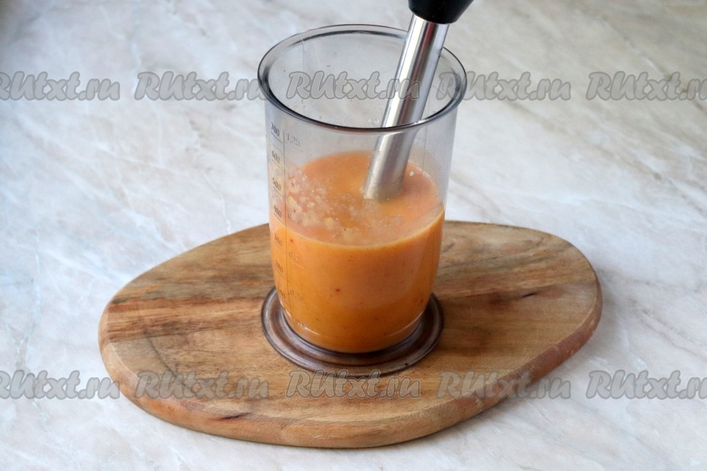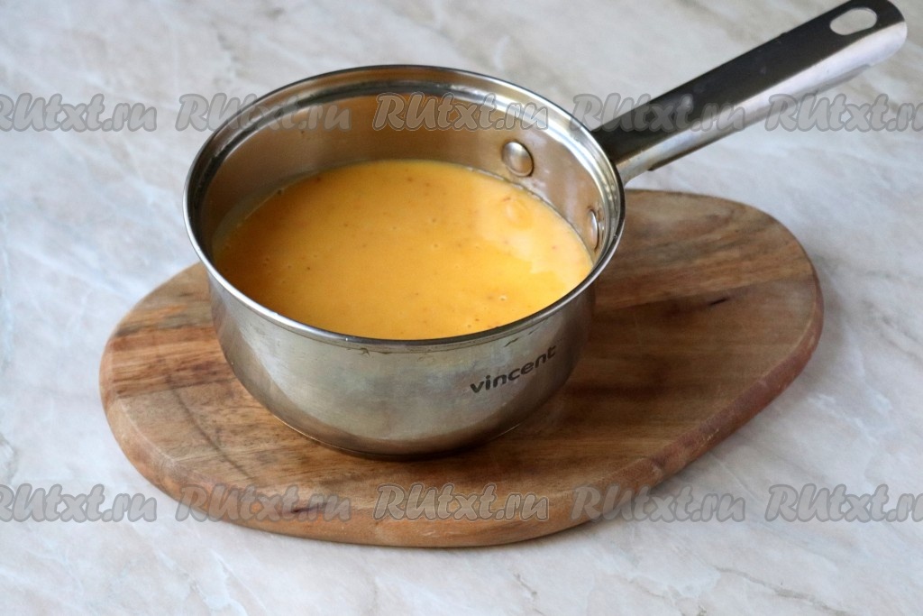 Смесь персикового пюре и яиц перелейте в небольшой сотейник и отправьте на медленный огонь. При постоянном помешивании доведите массу до кипения.