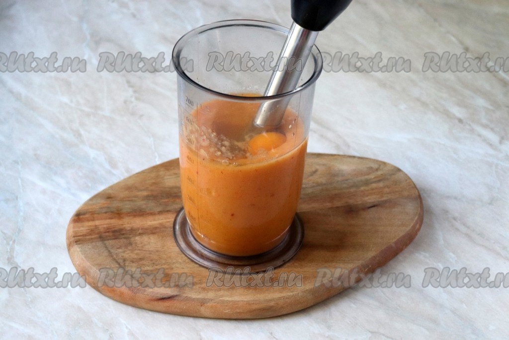 Затем в персиковое пюре вбейте куриные яйца и снова перемешайте.