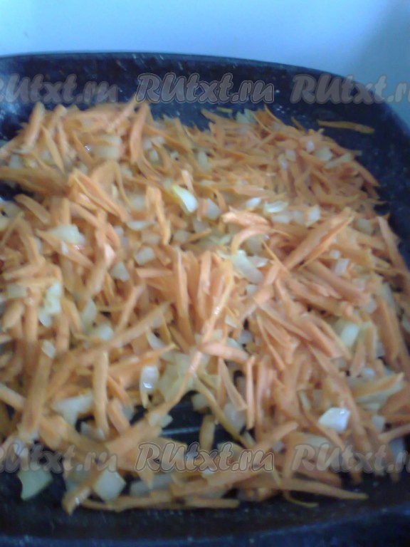 В глубокой сковороде нагреть растительное масло, выложить морковку с луком и обжарить на среднем огне, помешивая, до мягкости.