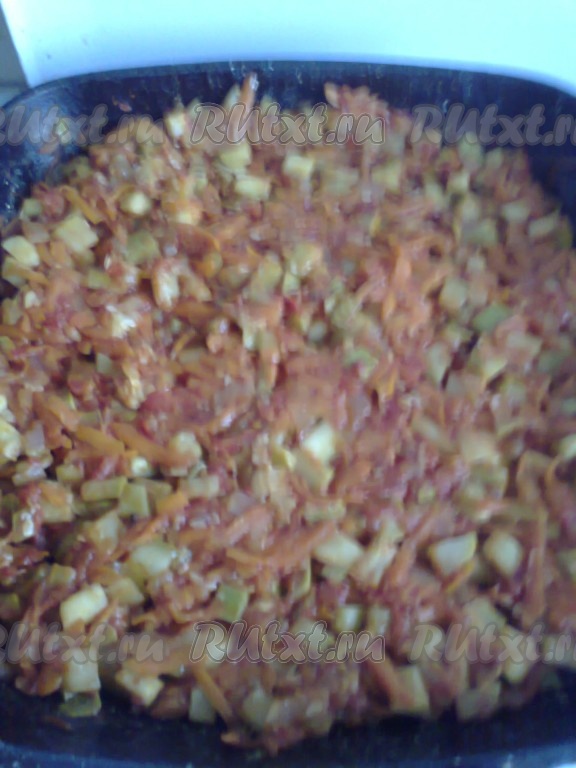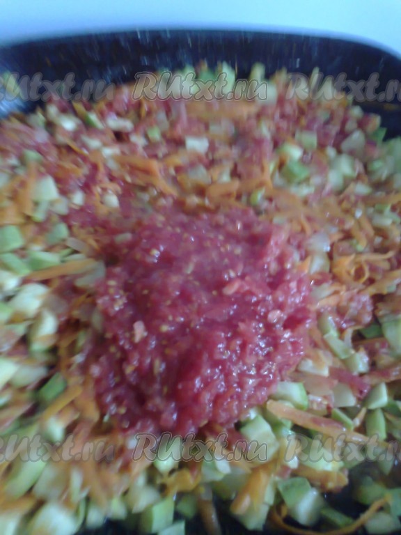 Очищенный лук и молодые кабачки нарезать кубиками (если кабачки с твёрдой кожурой, то их надо очистить от кожуры, а затем нарезать кубиками). Морковь очистить и натереть на крупной тёрке. Помидоры натереть на тёрке так, чтобы шкурка осталась в руках (можно сперва очистить помидоры от кожицы, предварительно опустив их в кипяток на 1-2 минуты, а затем опустив в холодную воду, и измельчить блендером).