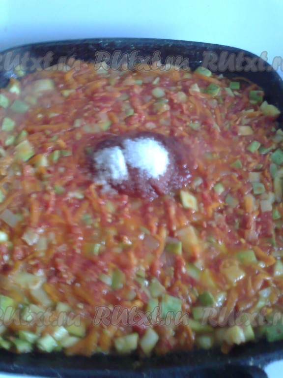 К обжаренным овощам добавить кабачки, посолить по вкусу, перемешать и готовить на среднем огне до мягкости (около 5 минут), периодически помешивая.