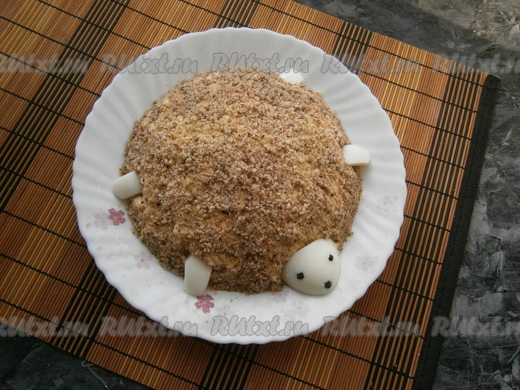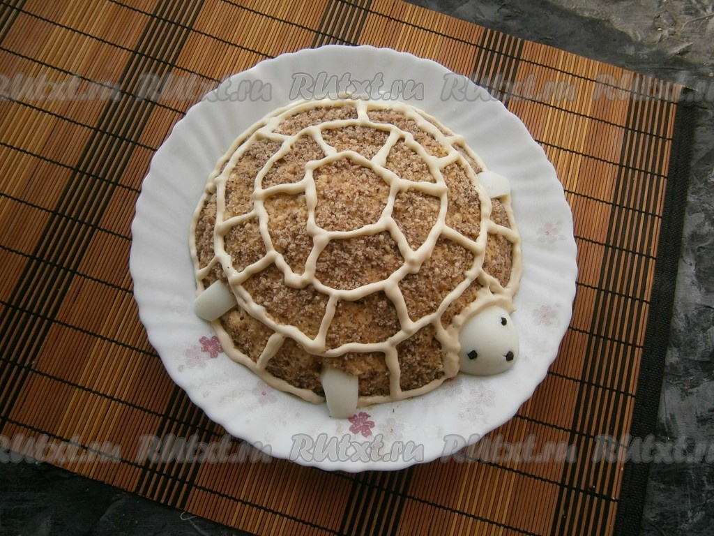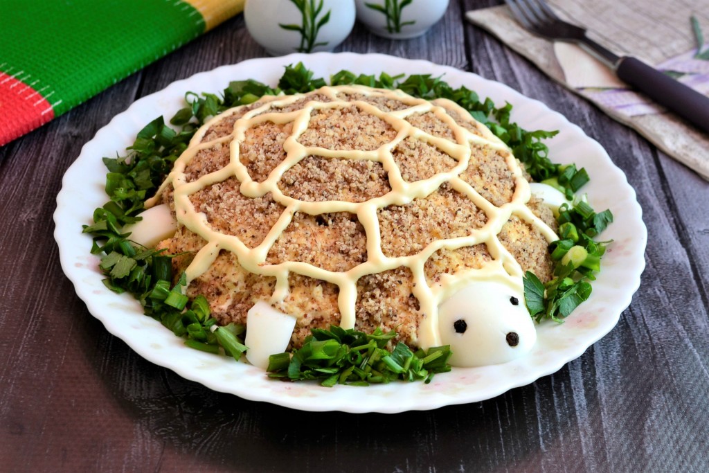 От оставшегося яичного белка отрезать третью часть с узкой стороны, вставить глазки и ротик из перца горошком, имитируя голову черепашки, разместить голову на краю салата. Остальную часть белка нарезать на небольшие плоские кусочки и вставить с чётырех сторон в салат в виде лапок черепашки (см. фото).