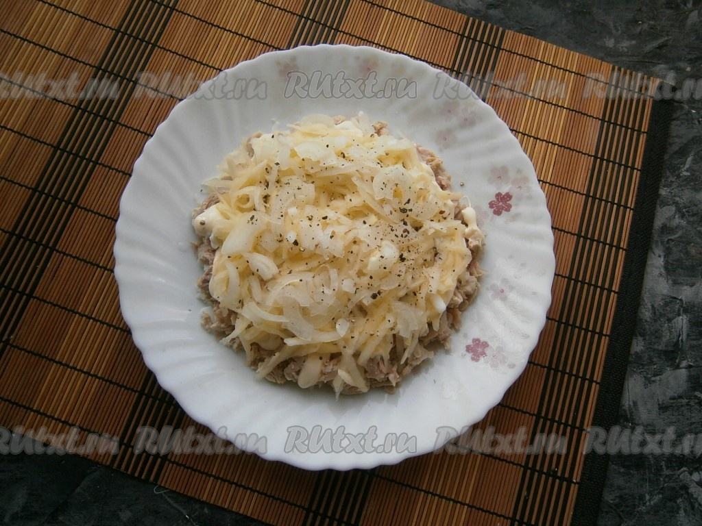 Яблоко вначале очистить от кожуры и семян, а затем натереть его на крупной тёрке, разместить третьим слоем. На яблоки выложить очищенный и нарезанный тонкими четвертинками репчатый лук, посолить, поперчить.