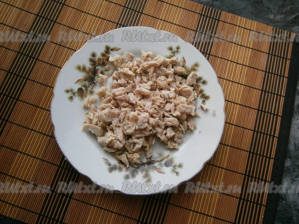 Куриное мясо отварить в подсоленной воде в течение 40-45 минут с начала закипания, остудить. Яйца отварить в течение 8-10 минут с начала кипения воды, затем, дав им остыть, очистить. Мясо курицы нарезать мелкими кусочками.