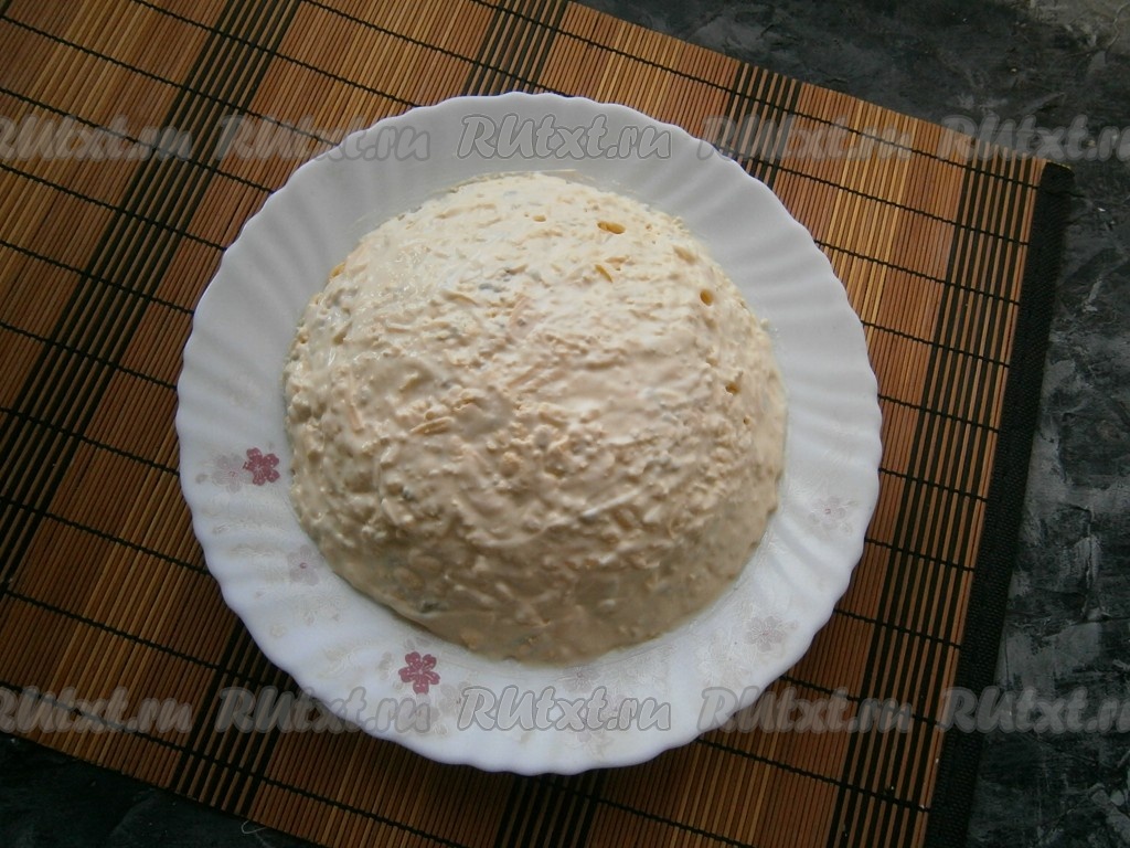 Щедро и аккуратно (не придавливая салат, чтобы он не потерял форму и пышность) смазать весь салат майонезом, тщательно разровнять. Вид салата должен получиться, как полушар.