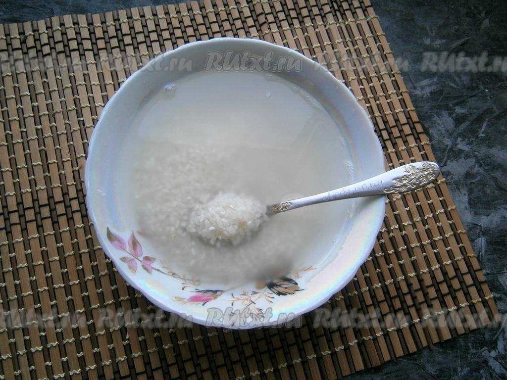Рис полностью залить кипятком на 5-7 минут, после чего воду слить, а рис промыть.