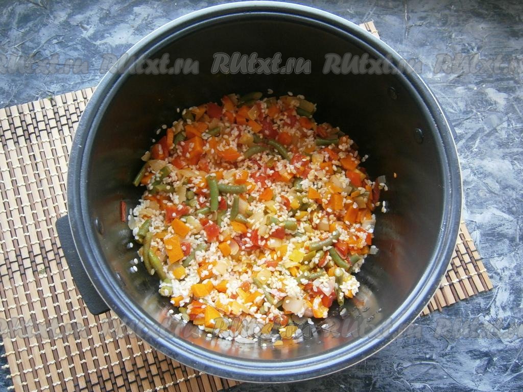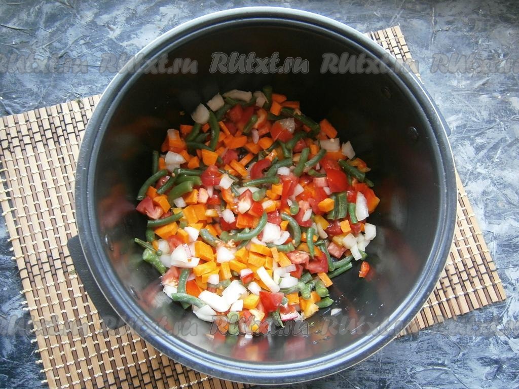 3-4 столовые ложки растительного масла влить в чашу мультиварки, выставить режим "Жарка" на 20 минут. Через 5 минут выложить в чашу перемешанные морковку, перец, стручковую фасоль, помидоры и лук.