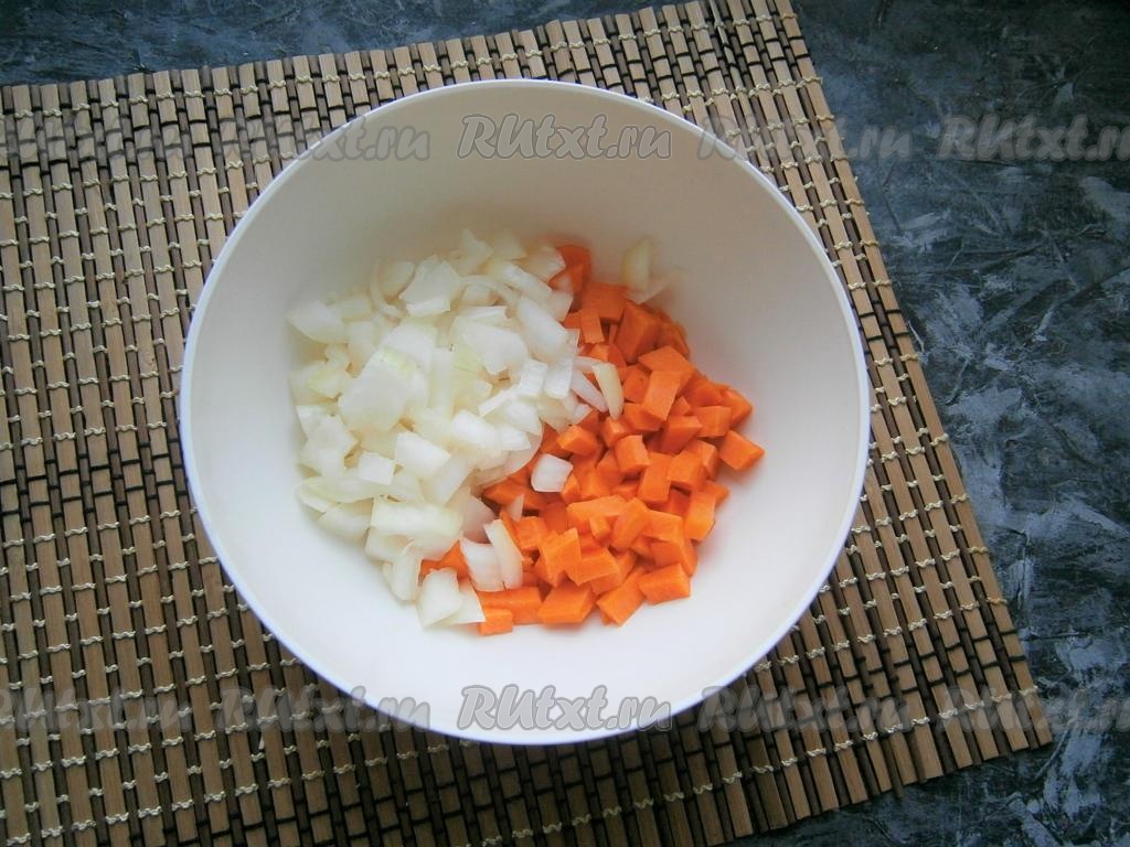 Болгарский перец, очищенный от семян и плодоножки, и свежие помидоры тоже нарезать средними кубиками, выложить их к луку с морковкой.