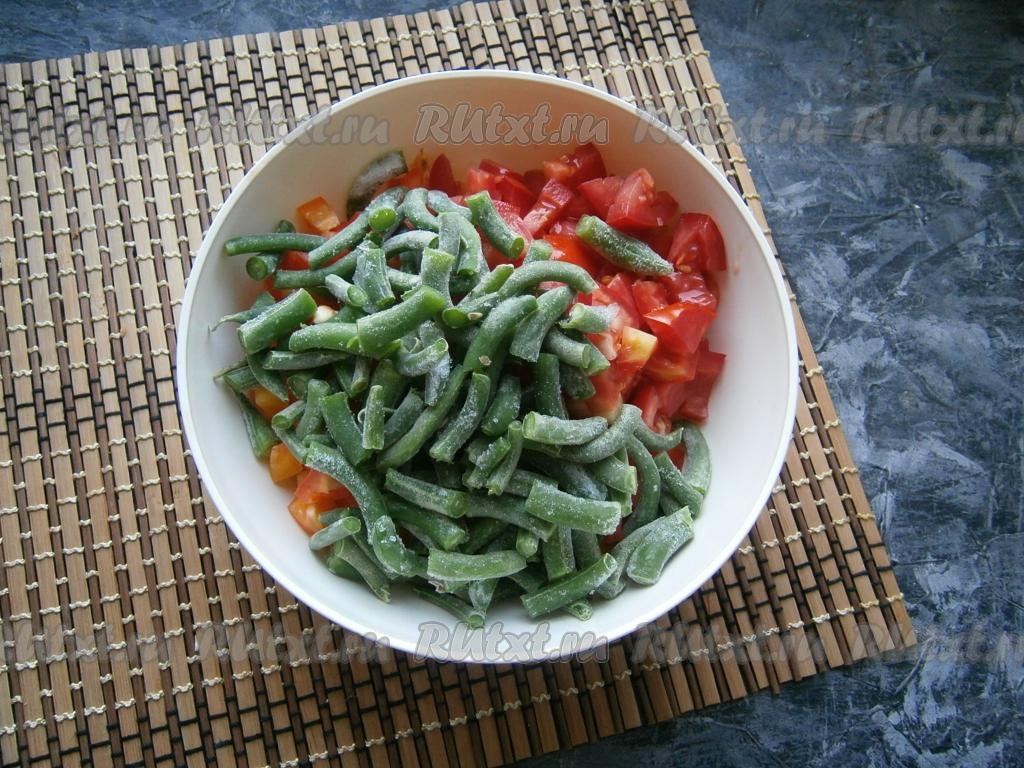 У свежей стручковой фасоли отрезать "хвостики" с двух сторон, а затем нарезать стручки на несколько частей (у меня свежемороженая фасоль), выложить к нарезанным овощам, перемешать.