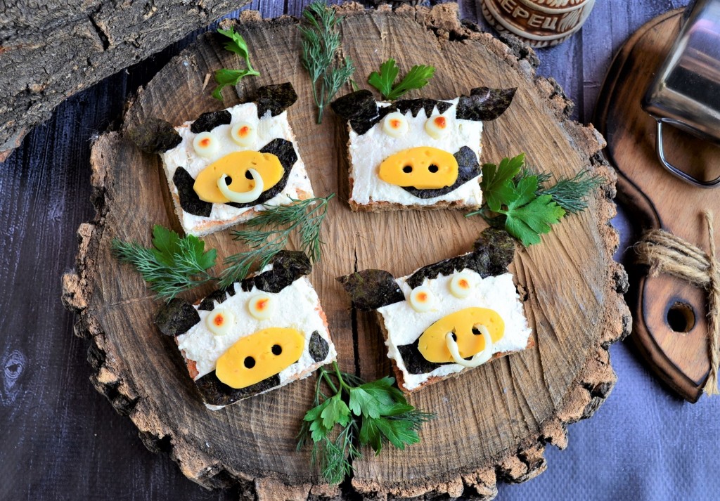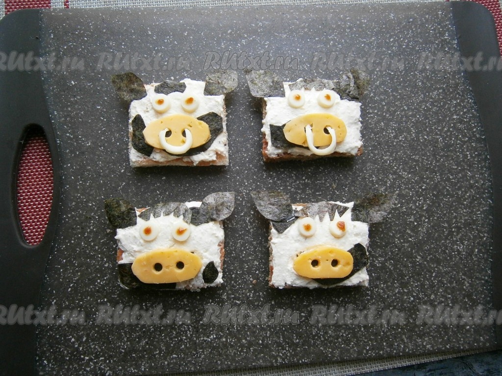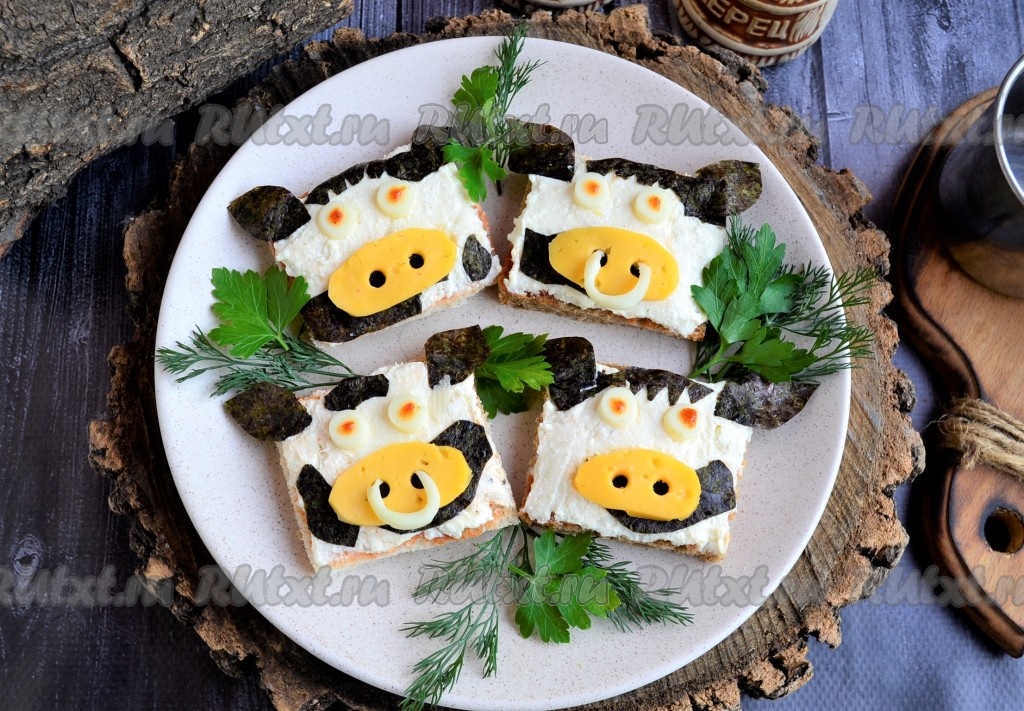 Теперь осталось бутерброды украсить в виде мордочек быков. Для этого из листа нори вырезать ушки, чубы и хаотичные кусочки в виде пятен, оформить на бутербродах. Нос вырезать из тонких ломтиков твёрдого сыра, в которых сделать отверстия (ноздри) колпачком шариковой ручки, выложить на бутерброды. Глазки также колпачком (или чем-то другим) выдавить из белого сыра, разместить на бутербродах, капнуть точки кетчупом, имитируя зрачки. И, по желанию, из белого сыра вырезать тонкие полосочки и вставить их в ноздри в виде колец.