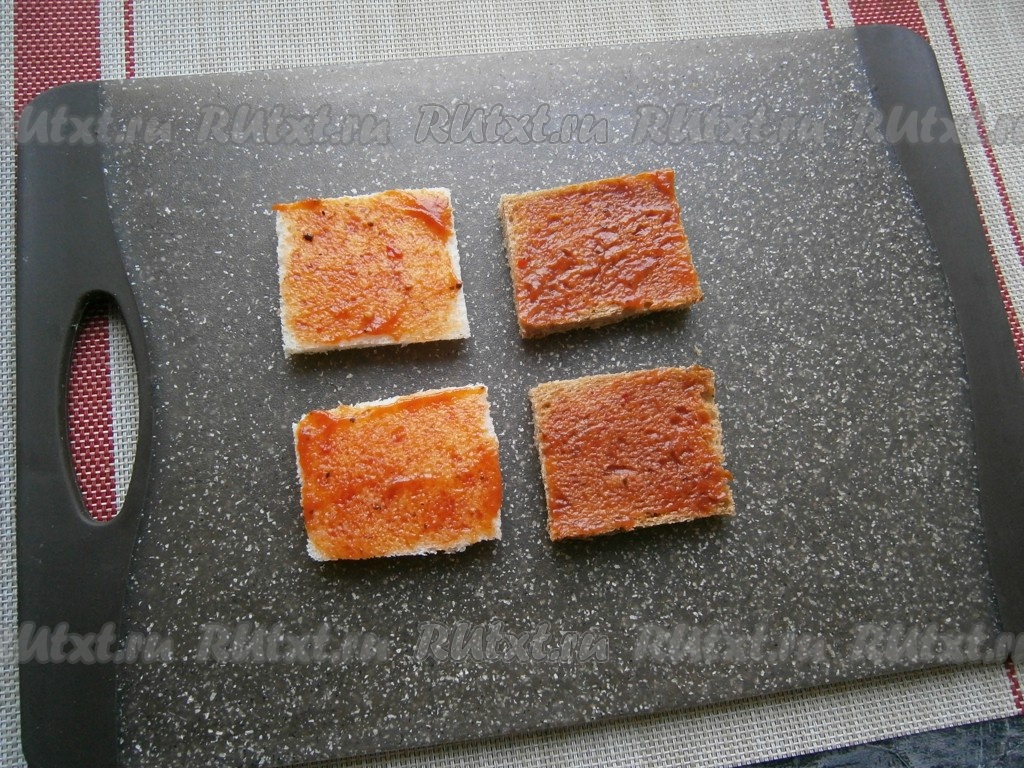 Ломтики хлеба немного смазать кетчупом (тонким слоем, чтобы он сразу впитался в мякиш).