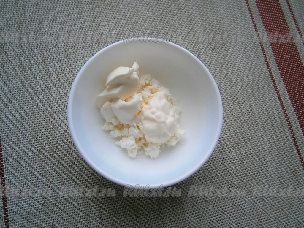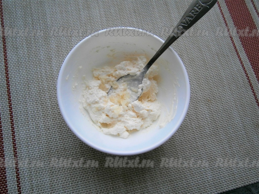 Тщательно размять творожно-сырную массу, добавить мелко нарезанный чеснок и немного соли, перемешать.