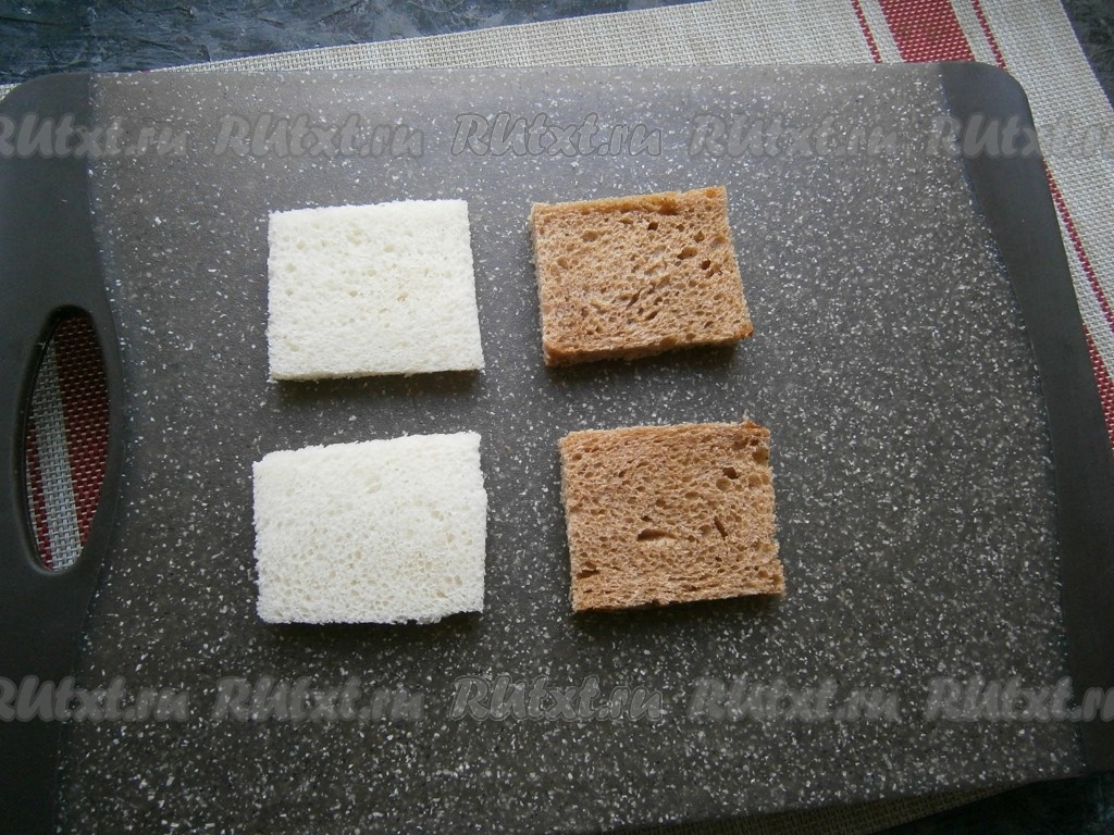 Ломтики хлеба (я взяла и чёрный, и белый хлеб) обрезать так, чтобы получились квадраты.
