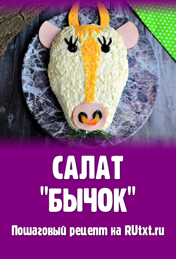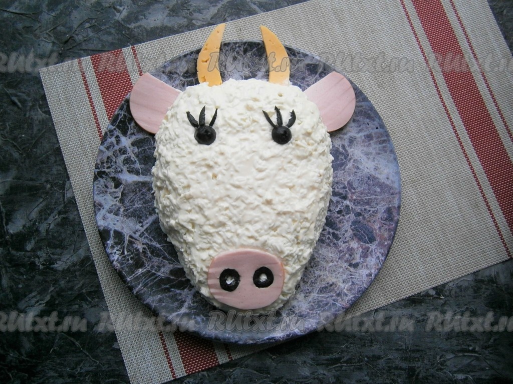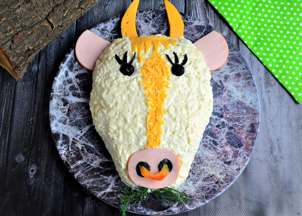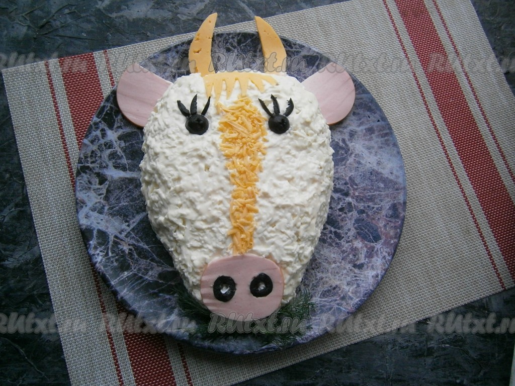 Осталось салатик украсить, для этого из кружочков колбасы вырезать нос и уши быка, разместить на блюде. Из оливок сделать глаза и ресницы, а также ноздри, которые вставить в отверстия, вырезанные в кружочке колбасы, который имитирует нос, выложить на салат. Из сыра вырезать рога и чёлку быку.