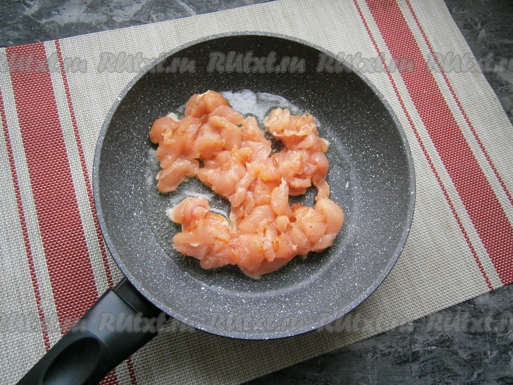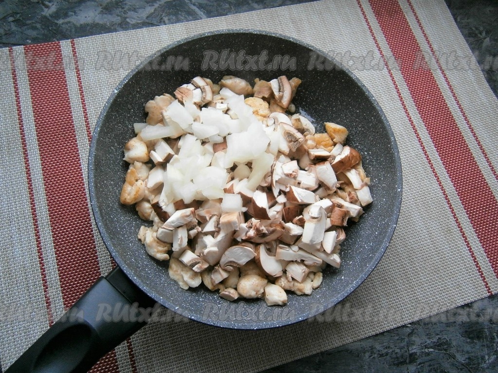 Обжарить куриное филе на среднем огне в течение 5 минут, иногда помешивая, затем добавить нарезанные небольшими кусочками шампиньоны и лук.