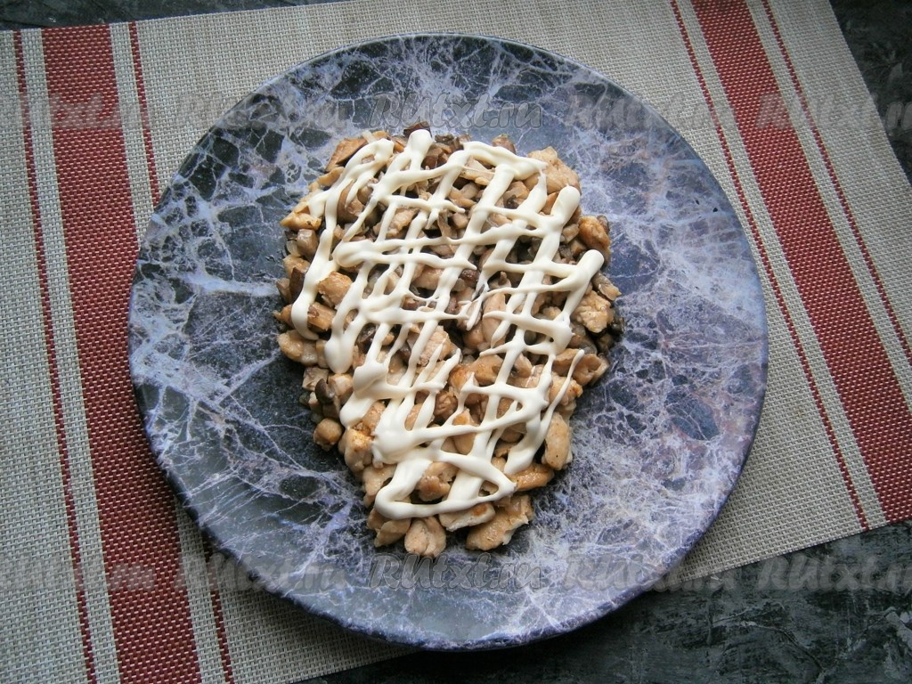 Куриное филе с грибами остудить и выложить на большую плоскую тарелку в виде головы быка, нанести щедрую сеточку из майонеза.