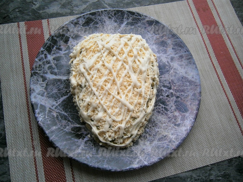 Яйца разделить на белки и желтки. Желтки натереть на тёрке и выложить их третьим слоем, посолить и нанести майонез в виде сеточки.