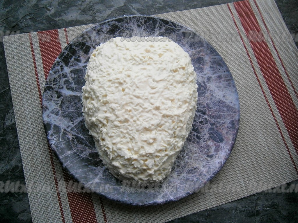 Белки натереть на средней тёрке и полностью покрыть ими весь салат (и с верху, и с боков), щедро смазать майонезом, разровнять.