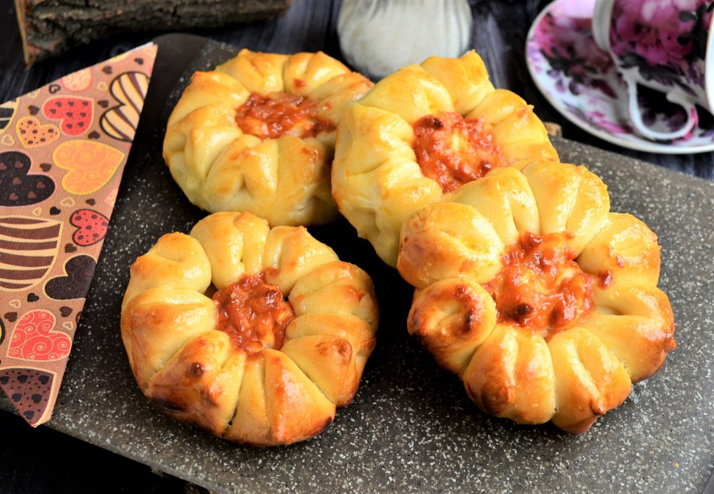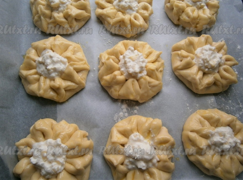 В серединку булочек-цветочков выложить по 1-2 столовые ложки творожно-яблочной начинки.