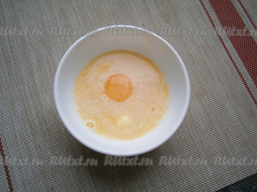 Накрыть дрожжевую смесь плёнкой и оставить в тепле на 15 минут (на поверхности должна появиться пышная дрожжевая шапка). В отдельной ёмкости растопить сливочное масло, остудить до тёплого состояния, добавить сырое яйцо, хорошенько перемешать масляно-яичную смесь.