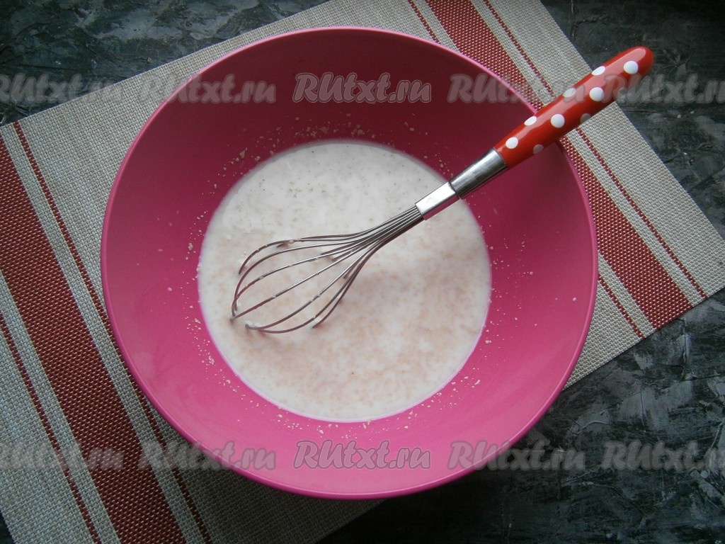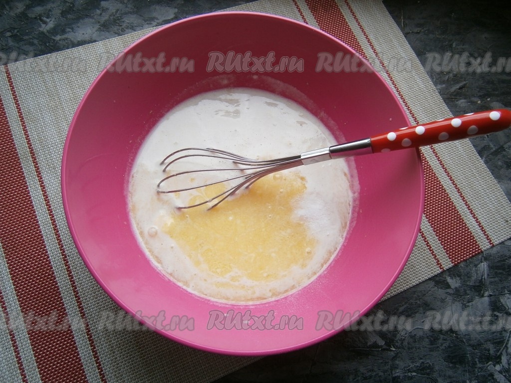 Вначале приступим к замесу дрожжевого теста. В тёплое (градусов 30-35) молоко всыпать сахар и дрожжи, перемешать.