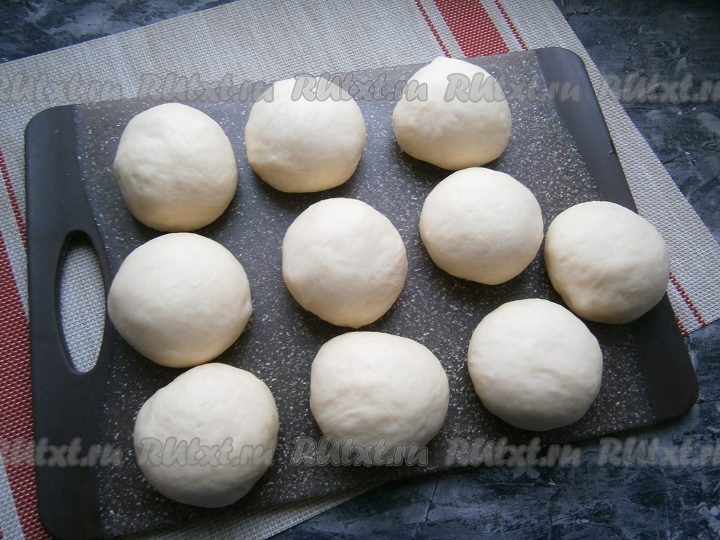 Тесто разделить на 10 частей, каждая по 90-100 грамм, но лучше сделать 9 частей, так как на противень помещается именно столько. Мне пришлось одну булочку выпекать отдельно. Подкатать части теста в шарики.