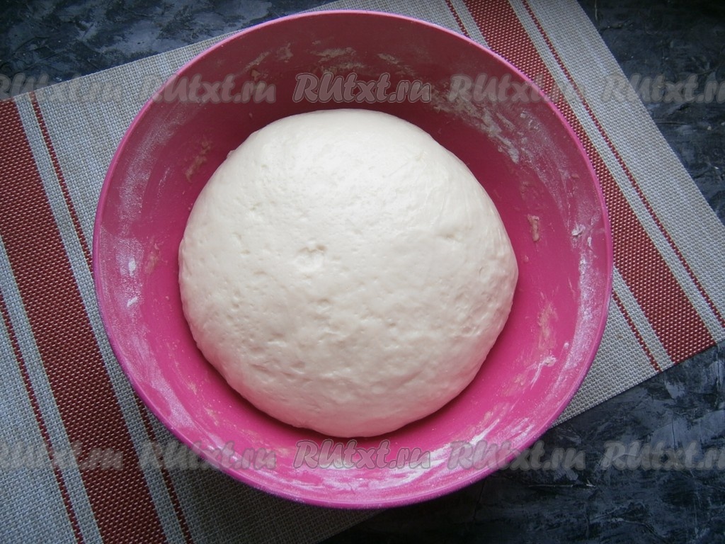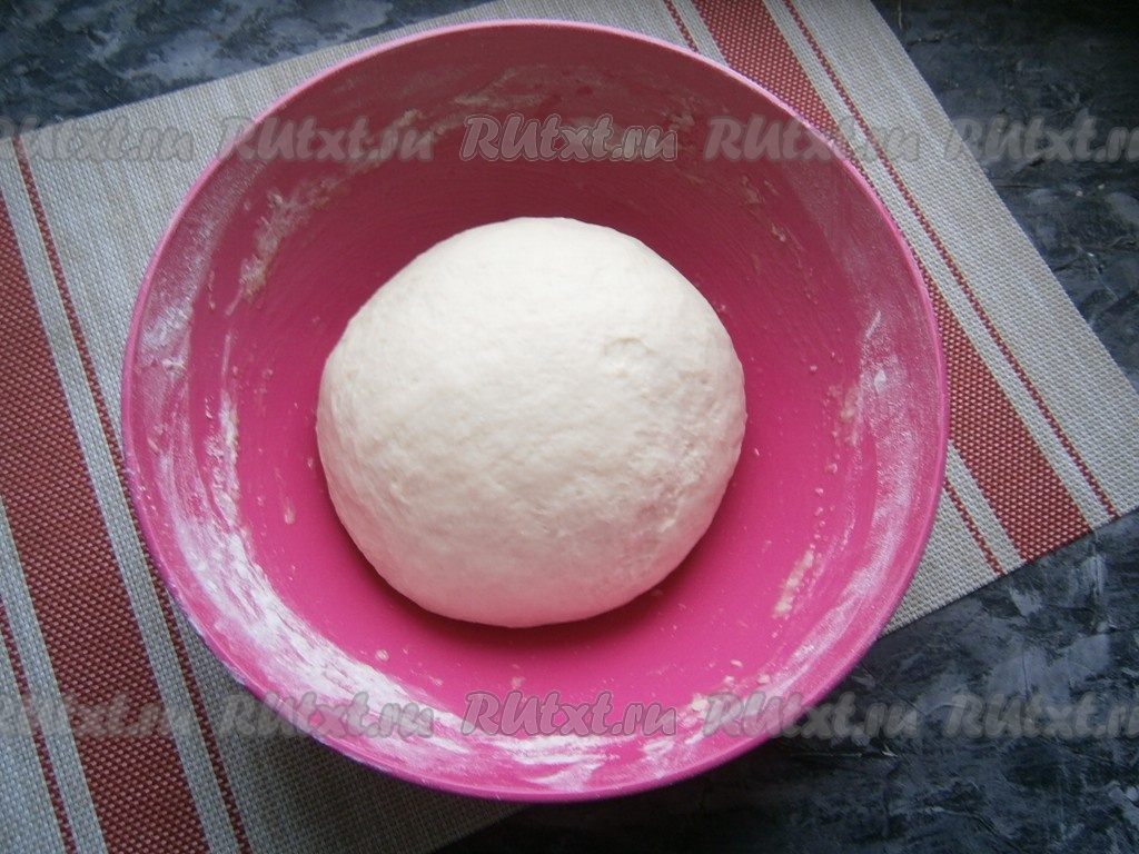 Тесто вымешивать минут 10, оно вначале будет липким, но муки много не добавляйте, ею нужно только подпылять поверхность стола. В итоге тесто должно получиться не липким и мягким. Миску смазать растительным маслом и поместить в неё тесто, накрыть плёнкой и оставить в тёплом месте на 1 час.