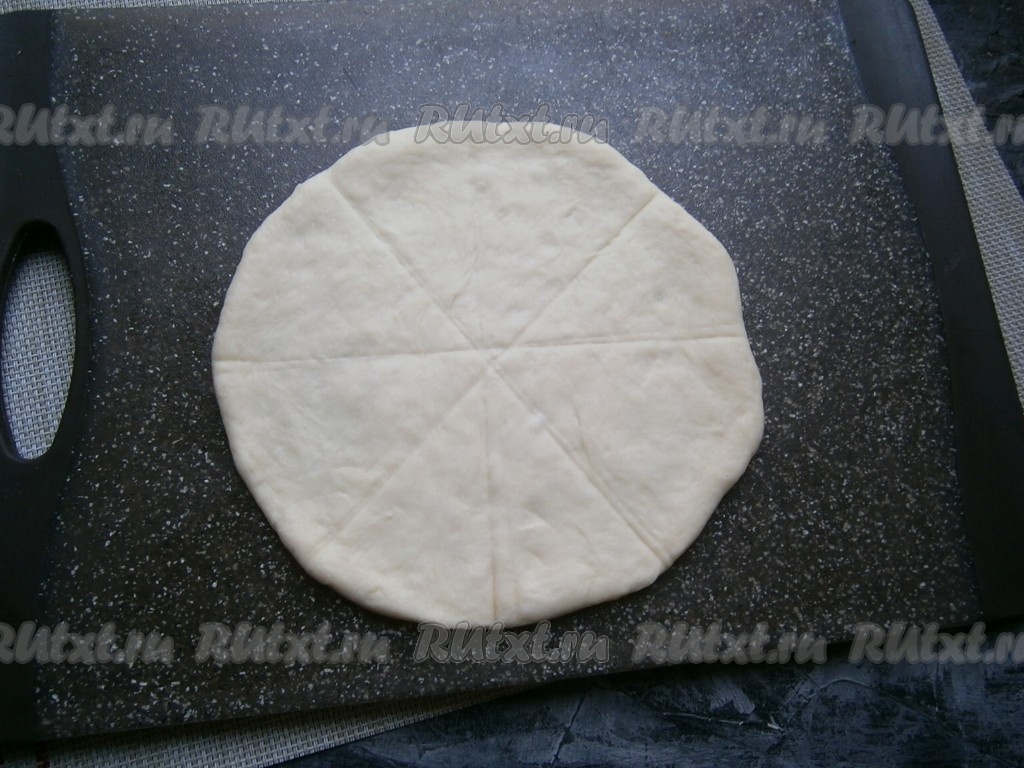 Каждый шарик теста на поверхности, припылённой мукой, раскатать в лепёшку диаметром около 15-16 см. Шпателем для выравнивания торта или ножом поделить (не разрезая) лепёшку на 8 частей (секторов).