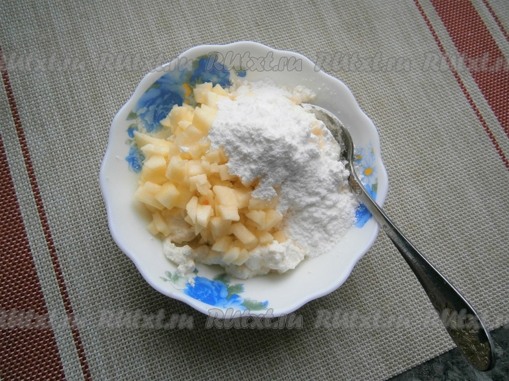 В получившуюся творожную массу всыпать сахарную пудру. Добавить нарезанное маленькими кубиками, предварительно очищенное от кожуры и сердцевины, яблоко.