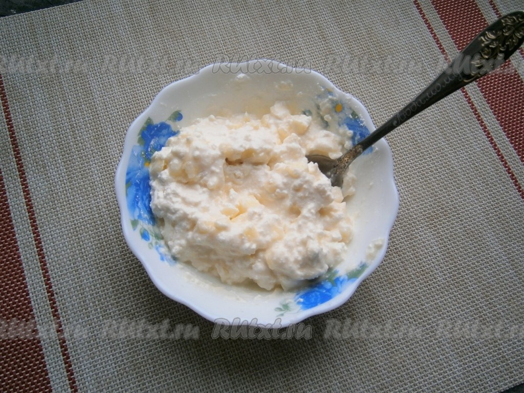 Теперь займёмся начинкой, для этого в творог нужно добавить сырой яичный белок, перемешать ложкой.