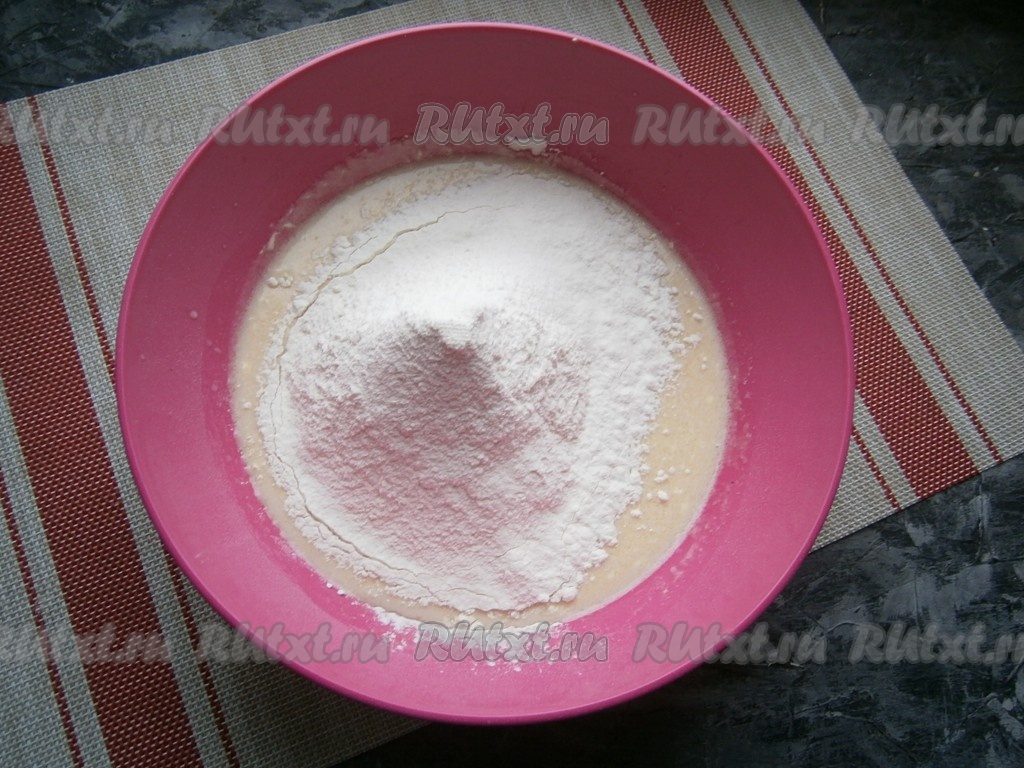 Муку просеять частями прямо в миску с жидкой смесью, замешивая тесто.